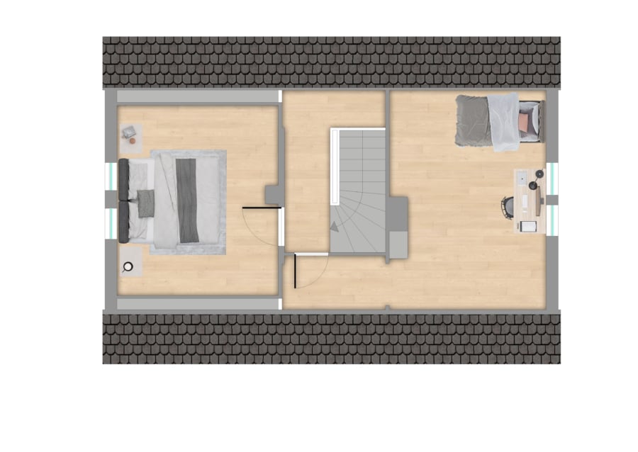 Das Dachgeschoss ist über eine vollwertige Treppe erschlossen und bietet zwei weitere Zimmer. Abgerundet wird das Platzangebot durch einen Spitzboden, der zusätzlichen Stauraum bietet.
