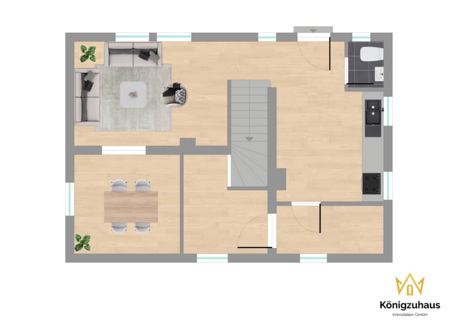 Im Erdgeschoss betreten Sie das Haus über eine großzügige Diele. Von hier aus gelangen Sie in das Esszimmer mit angrenzender Küche, in ein Badezimmer sowie in den auf dieser Ebene liegenden Keller- und Heizungsraum.