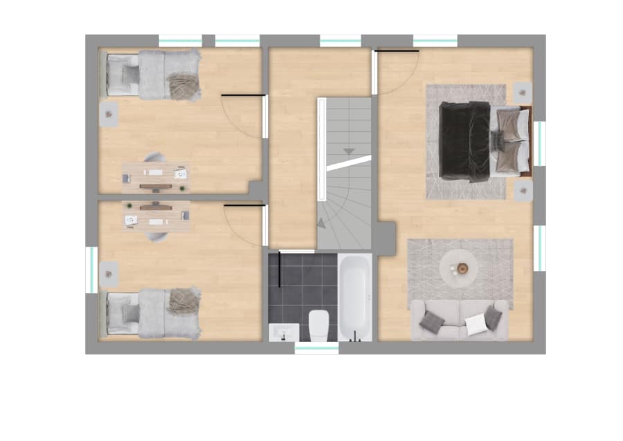 Im Obergeschoss sind zwei helle Zimmer, ein Bad sowie ein geräumiger Wohnbereich vorgesehen.