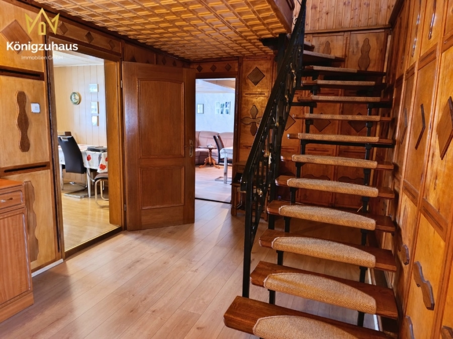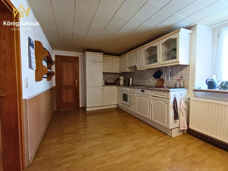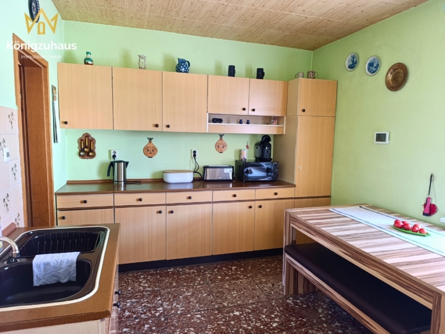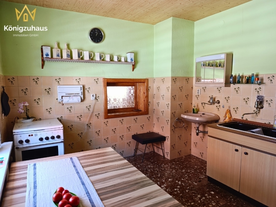 Im Zentrum steht das Wohnhaus. Mit rund 182 Quadratmetern Wohnfläche bietet es ausreichend Platz für Familienleben, Gemeinschaft und Rückzug. Zwei Küchen und zwei Wohnzimmer ermöglichen es, dass mehrere Generationen unter einem Dach wohnen können, ohne auf ihre eigenen Bereiche verzichten zu müssen. Drei weitere Zimmer lassen sich flexibel als Schlafzimmer, Gästezimmer oder Arbeitsräume nutzen. Ein großzügiges Bad mit Wanne und Dusche, ein separates Gäste-WC, der praktische Wäscheboden sowie der angrenzende Gewölbekeller machen den Alltag komfortabel. Highlight ist die Dachterrasse, die wie ein kleiner privater Rückzugsort im Freien wirkt – ideal für Sommerabende, sonnige Frühstücke oder stille Momente am Abend.