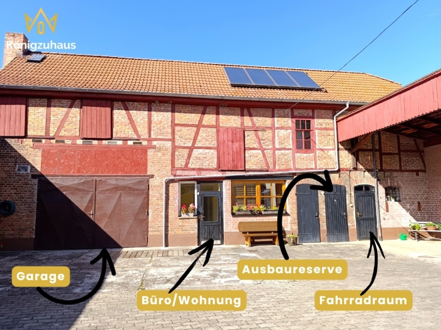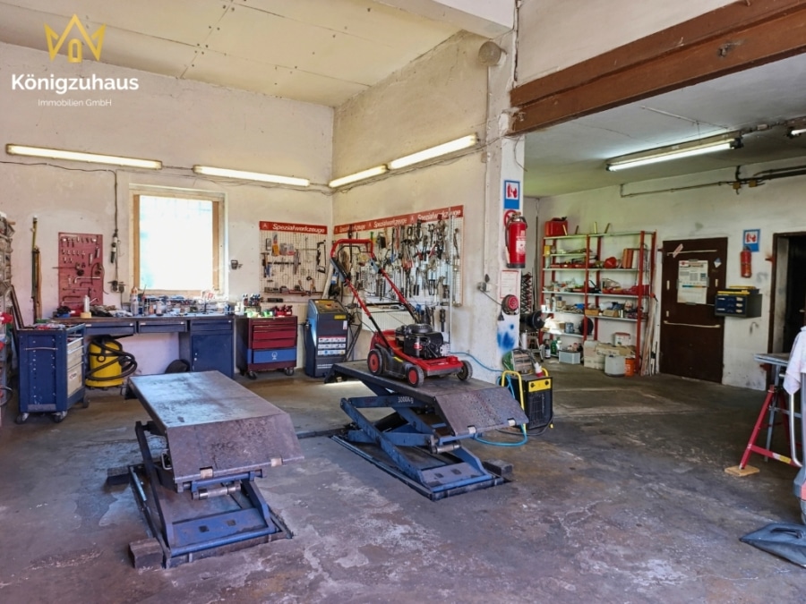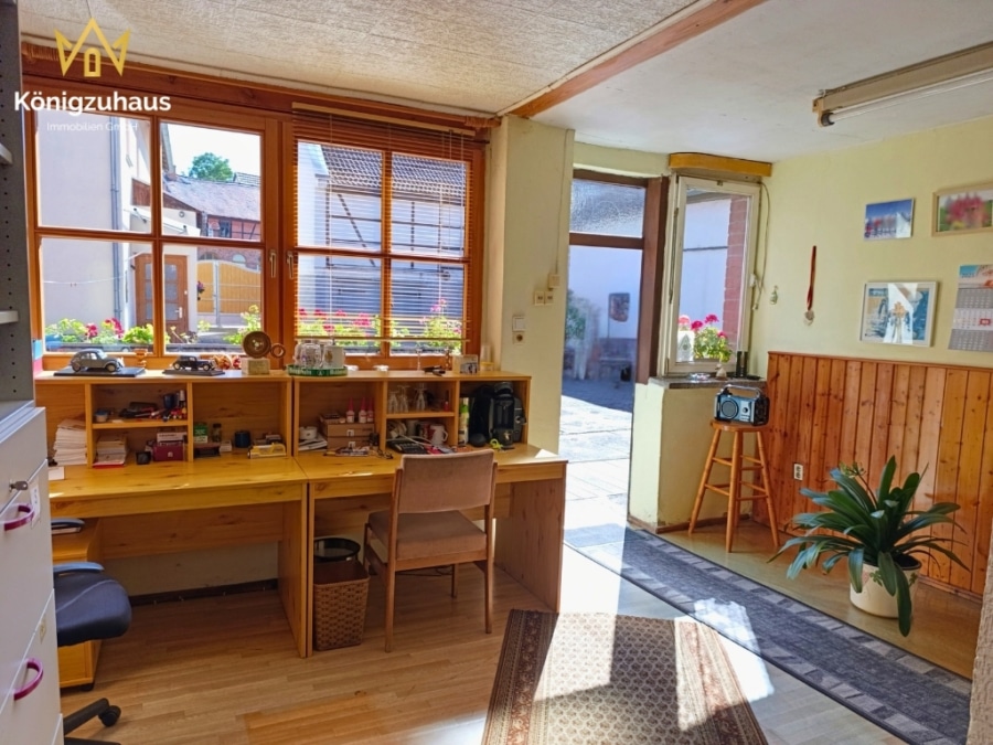Doch das Besondere dieses Anwesens liegt nicht nur im Wohnhaus. Die Nebengebäude verleihen dem Hof seinen einzigartigen Charakter. Eine große Werkstatt mit Hebebühne eröffnet perfekte Bedingungen für Handwerker oder Selbstständige, die Wohnen und Arbeiten verbinden möchten. In der Scheune wurde bereits eine Zwei-Raum-Wohnung ausgebaut – optimal für Gäste, erwachsene Kinder oder zur Vermietung. Ein separates Büro mit eigenem Bad schafft zusätzlich Raum für Homeoffice oder ein kleines Gewerbe. Das ehemalige Stallgebäude dient heute als Garage und Lager und bietet reichlich Platz für Fahrzeuge, Material oder Vorräte. Darüber hinaus wartet ein weiteres Nebengebäude noch auf seine neue Bestimmung – ob als Atelier, zusätzlicher Wohnraum oder Hobbybereich.