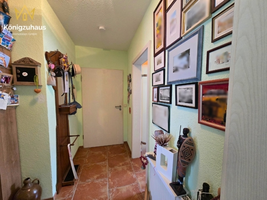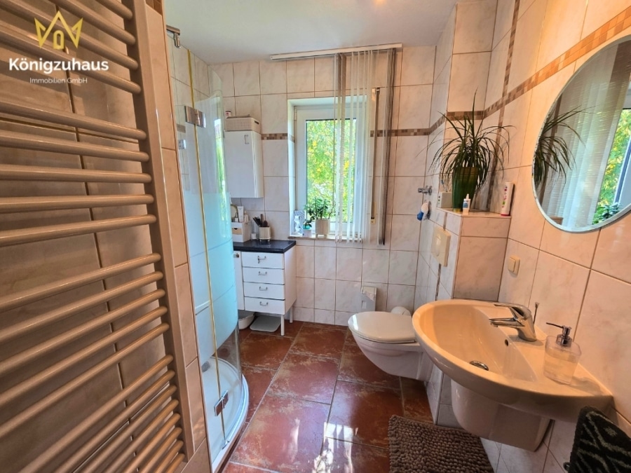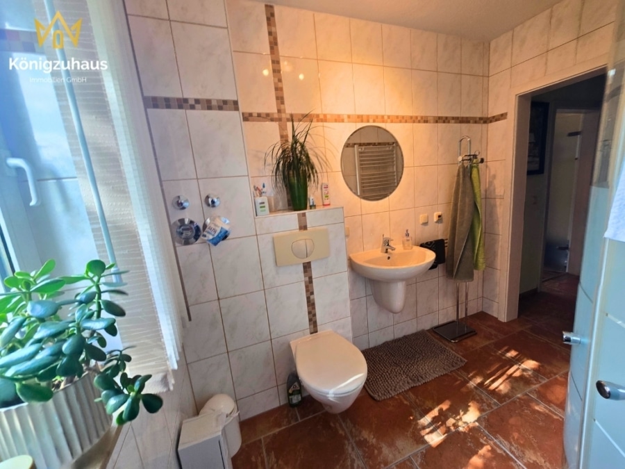 Das Tageslichtbad mit Fenster wirkt hell und freundlich. Ein praktischer Flur verbindet alle Räume miteinander und schafft eine offene Wohnatmosphäre.