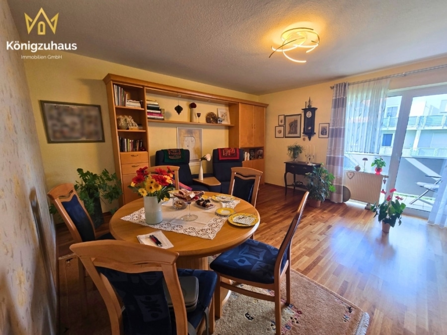 Das Herzstück ist das großzügige Wohnzimmer mit direktem Zugang zum Balkon. Von hier aus genießen Sie einen wunderbaren Ausblick ins Grüne – perfekt zum Entspannen oder für gemütliche Stunden.